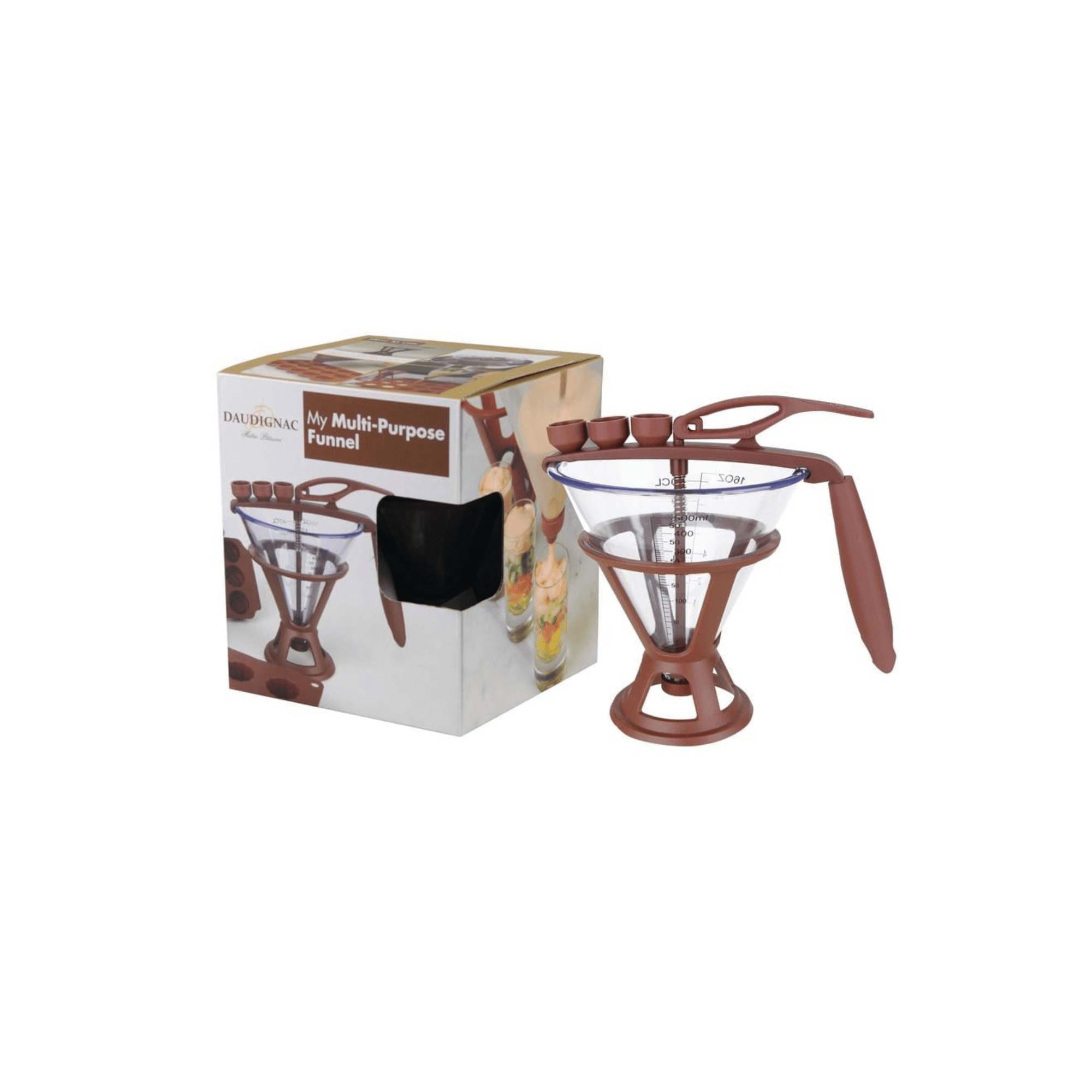 Daudignac Funnel is very multi-purpose. This piston funnel used to decorate sauces or coulis on your plates. Simply squeeze the trigger until dough flows precisely, without any waste, then release it to the filling stops instantly. The funnel can be used in a bain-marie or microwave so you can maintain temperature, heat or warm your preparations while keeping the contents in the funnel. It adapts to the liquid preparations such as molten chocolate or creams. Capacity: 0.5 litre. It contains 1 x automatic funnel with 9 parts, 1 x spatula.